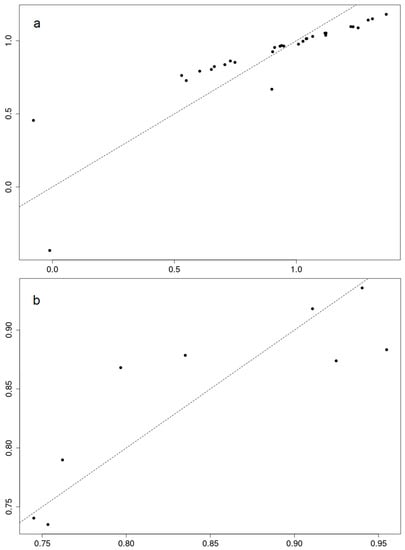 Figure 12 represents how well the stations represented by each PC are adjusted by the linear model. The line represents the perfect adjustment, so the horizontal distance between the line and each point characterizes the residuals. For PC1 (Figure 12a), the regression has R2 = 0.71, with p-value = 5.05 × 10−9. Based on p-values for each variable, shown in Table 2, the only variable that seems to impact the loadings is the catchment area, while permeability and altitude are not statistically significant. This result confirms the hypothesis that stations 5019, 5025, and 5032, not shown in Figure 12, had to be studied separately; due to their exceptionally large catchment area, they can be considered as outliers in the regression analysis. These results are in accordance with the hypotheses studied by Heudorfer and Stahl [45] and van Langen et al. [46].