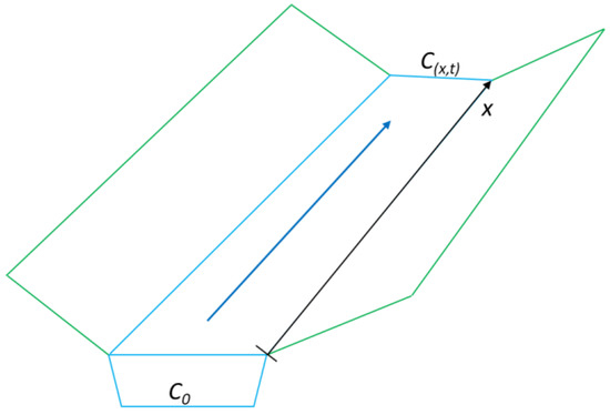 Using a constant concentration boundary condition at x0 = 0 [L] (the inlet point of a surface water body reach) at the initial time (t0 = 0) [T], for each x > 0 and t > 0 the Equation (1) may be reduced to the following analytical solution (2) [10,37].