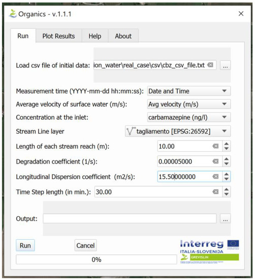 By clicking on ORGANICS in the Plugin menu, the main window opens. This is divided in four sections: (1) Run; (2) Plot Results; (3) Help; (4) About. By entering the Run section, the user input the following data (Figure 2):