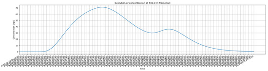 In this test we simulated a time-limited pulse C0 = 100 ng/L mass injection for a 2 h duration. This time-limited pulse case, at constant concentration, can be implemented by defining in the *csv file an initial period (of known duration, with concentration C0; first line in the *csv file) followed by a second period with zero concentration (second line in the *csv file). In this test, the second input is then two hours long with concentration set at C2h = 0 ng/L. The solution is then displayed in Figure 9 at an infinite time (that is, the time needed for the dissolved substance to reach the outlet of the water course considered). The solution is presented at x = 500 m (Figure 9). At this distance, mass arrival is recorded after 30 min from the beginning of the simulation.
