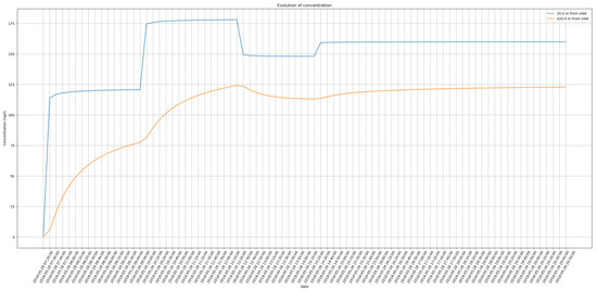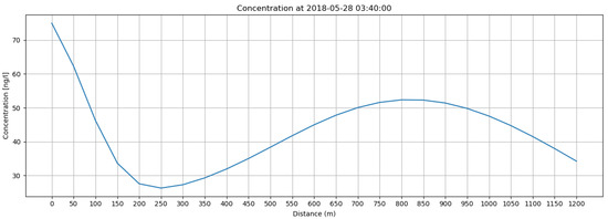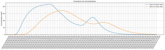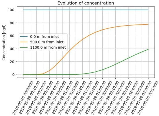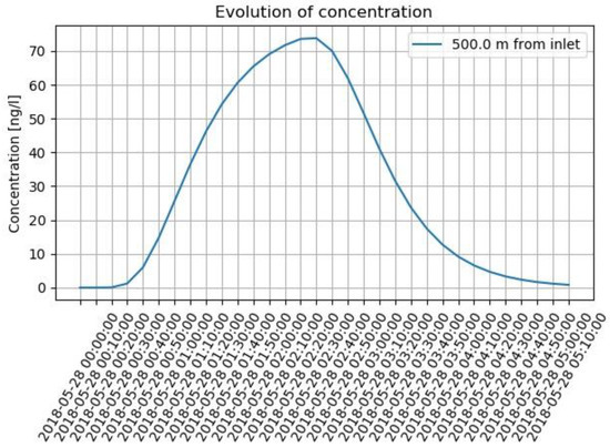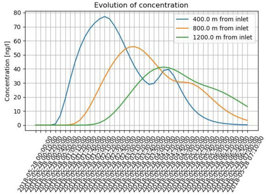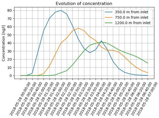 A multi-pulse boundary condition was prepared by exploiting data from the five monitoring points. Figure 14 shows the simulated carbamazepine concentration at the outlet point, PSMz, 420 m from the inlet point. The Simulated value (PSMz_sim) column in Table 3 presents the simulated value against the measured ones (Outlet (PSMz) column). In Figure 13 CBZ simulated concentrations are themed with color scales depending on the concentration value.