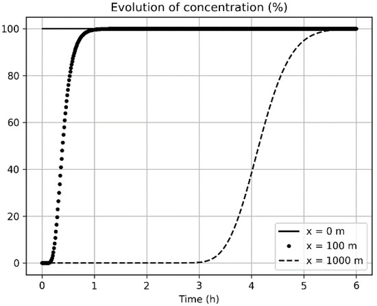 In this test, we simulated C0 mass input, variable over time (multi-pulse input condition) according to data presented in Table 2. The global solution works as the superposition of the several pulses, each one having a constant condition for a specified time interval. Superposing each “pulse-solution” makes the model able to consider time-dependent boundary conditions. Results are shown at x = 400 m, x = 800 m, and x = 1200 m from the inlet point for time step length of: