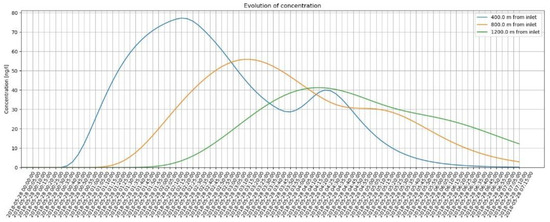 Figure 11. Simulated concentration at x = 400 m, x = 800 m, and x = 1200 m from the inlet point with 10 min time step length.