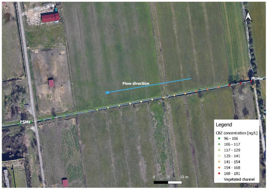 The ORGANICS plugin was then applied to compute the concentration of the pharmaceutical compound carbamazepine at a reach of a vegetated channel receiving poorly treated wastewater, in low-flow conditions, in the Pisa municipality (Tuscany, Italy, Figure 13). Carbamazepine (CBZ) is an anticonvulsant or anti-epileptic drug commonly found in poorly treated wastewater and consequently in surface- and ground-water [45,46]. Removal efficiency in secondary wastewater treatment is typically less than 10% for CBZ [47]. Composite samples (2 volumes of 0.5 L every 30 min representative for one hour) were collected approximatively every two hours during an experiment run on 28 May 2018 at the inlet (point PSMw = 0 m) and the outlet (point PSMz = 420 m) of the channel reach (Figure 13) in low-flow conditions. Analytical determinations were performed following the method described in [48]. Mean longitudinal flow velocities were measured by means of an acoustic digital current meter (OTT Messtechnik GmbH, Kempten; Germany). Data for CBZ and mean longitudinal flow velocities are presented in Table 3.
