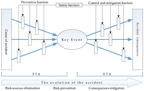 Compared with FTA and ETA, the BT model has its unique advantages. It clearly states the combination of the primary event that could lead to the top event and the failure of the safety barrier to escalate the top event to a specific consequence. BT analysis [30] is mainly used for risk assessment, barrier analysis, accident risk management, and to help understand specific risk conditions and systemic risk and prevention. BT method establishes corresponding safety barriers on the evolution path to prevent, control, and mitigate risk accidents. Preventive barriers are used to reduce the likelihood of an accident, while control and mitigation barriers are used to reduce the severity of the consequences and the duration of the accident to limit the escalation of the accident. The principle of accident risk prevention and control based on the BT method is shown in Figure 2. In the process of accident development, corresponding safety barriers should be established to eliminate danger sources, prevent deterioration, and reduce consequences.