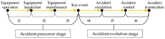 The concept of window of opportunity (WO) is mainly used in the medical field to indicate the best time to treat a disease [31,32]. The WO represents the best time to invest in a business and the best time to catch up with competitors [33,34]. In this paper, it is obtained from the BT model that, in the evolution path of suppressing accident escalation, there are two stages that can prevent and control the evolution of accidents, namely accident precursor stage before the occurrence of key events and accident evolution stage of key events into consequence accidents. The accident evolution is shown in Figure 3.