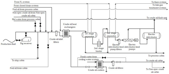 FPSOs are large-scale offshore floating production and offloading platforms integrating oil and gas production, processing, storage and export, power supply, and personnel life. FPSOs are composed of more than a dozen major systems such as subsea system, hull system, mooring positioning system, oil and gas processing system, power system, fire monitoring system, oil storage and export system, so on. The oil and gas processing system are an organic whole for the separation and processing of crude oil. A lot of oil and gas processing equipment is involved, including valves, flanges, pipelines, and so on. These are potential sources of oil and gas leakage. The flammable and explosive characteristics of oil and gas make the oil and gas processing system the most important high-risk factor of FPSOs. Additionally, crude oil treatment systems are mainly used to separate different types of substances produced by oil wells and then transport the separated oil, gas, and sewage to other systems for further purification. Its technological process is shown in Figure 5.