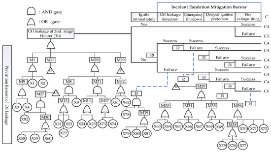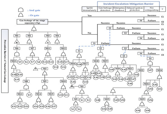 Here, the natural gas leakage of the separator and the crude oil leakage of the heater are regarded as the key events of the BT model. The left side is the FTA of the oil and gas leakage, and the right side is the ETA of the fire and explosion accidents. Additionally, for leakage detection failure, emergency shutdown failure, ignition protection failure, fire extinguishing failure, etc., corresponding accident analysis is carried out. Combined with data records and engineering experience, the causes and resulting events of leakage are summarized, and the BT model of natural gas leakage and the BT model of crude oil leakage are established, as shown in Figure 6 and Figure 7.