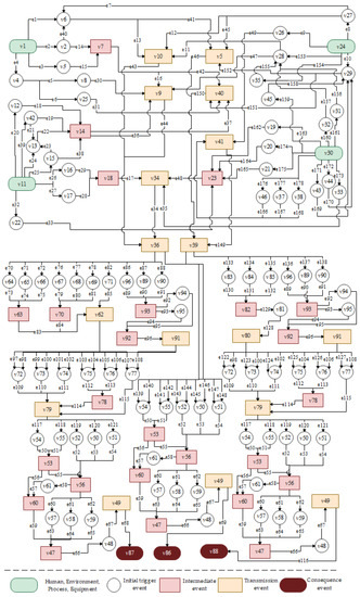 All the above-mentioned dangerous events are considered nodes in the developed network, and the logical relationships between the identified events are considered directed edges. Therefore, through logical deduction, a CN can be built from a trigger event to a consequence event [35], as shown in Figure 4.