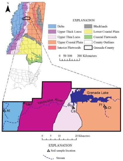 - Thomas, A.E. Soil Survey of Grenada County, Mississippi; US Dep. Agric.: Washington, DC, USA, 1967; pp. 1–76.