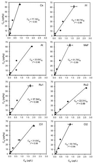 Linear isotherms closely fit observed data (Figure 2). Linear isotherms are commonly observed when adsorbate concentrations are relatively low or where the number of adsorption sites greatly exceeds the number of adsorbed molecules. For example, Homenauth and McBride [] reported similar behavior for sorption of aniline on several clay minerals (montmorillonite, vermiculite, and kaolinite) and an organic muck. Freundlich isotherms are only slightly nonlinear, with best-fit n values of 0.75–1.00 and Kf values similar to Kd values. Very large values of Cm for Langmuir isotherms (Table 4) also indicate their nearly linear nature within the concentration range tested. For these reasons, the slight curvilinear nature indicated by the Freundlich and Langmuir isotherms should not be overinterpreted, and given their simplicity the linear isotherms are better suited for representing ATX sorption for aqueous concentrations (Cw) below 15 μg/L. Klitzke et al. [] also reported linear behavior for isotherms at low equilibrium concentrations (Ce) of ATX (less than ~5–10 μg/L).