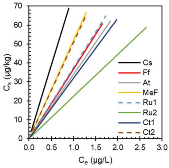 Best-fit linear isotherms for all samples (At, Alligator Association; Cs, channel sand; Ct1, Cuthbert Series A horizon; Ct2, Cuthbert Series B horizon; Ff, Falaya Silt Loam Series; MeF, Memphis Silt Loam Series; Ru1, Ruston Series A horizon; Ru2, Ruston Series E horizon).