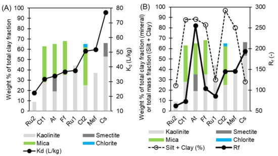 Water-dispersible clay-fraction mineral abundances and (A) linear isotherm coefficient (Kd), and (B) retardation factor (Rf) and silt and clay fraction (At, Alligator Association; Cs, channel sand; Ct1, Cuthbert Series A horizon; Ct2, Cuthbert Series B horizon; Ff, Falaya Silt Loam Series; MeF, Memphis Silt Loam Series; Ru1, Ruston Series A horizon; Ru2, Ruston Series E horizon).