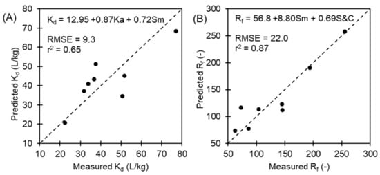 (A) Linear isotherm coefficient predicted using clay-fraction kaolinite (Ka) and smectite (Sm) weight percentages, and (B) retardation factor (Rf) predicted using smectite and silt and clay fraction (S&C) (RMSE, root-mean-square error).