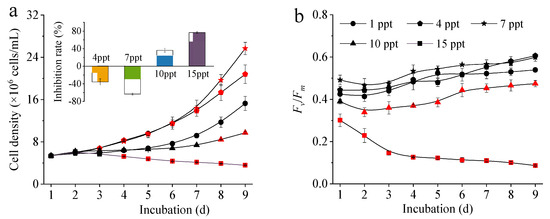 Changes in M. aeruginosa cell density and the inhibition rate of cell growth (a) and Fv/Fm (b) during the experiment under different salinity stresses. Red-filled legends indicate significant differences compared to the control (ANOVA, p < 0.05).