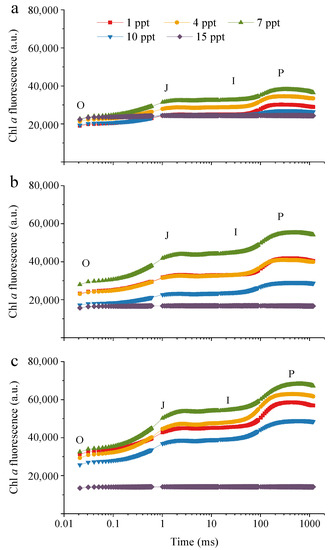 For algae, at high salinity levels, Na+ competes with Ca2+ for the binding sites of cell walls, reduces K+ levels, disturbs cellular ion homeostasis and affects protein synthesis and photosynthesis in algal cells [22]. During photosynthesis of algae, the energy absorbed by antenna chlorophyll (chl) is converted into chemical energy through the electron transfer of photosystem II (PSII) and photosystem I (PSI), and the remaining energy is dissipated in the form of heat and fluorescence [23]. After dark-adapted algae are suddenly exposed to visible light, the algae cells emit a dark red fluorescence with varying intensity. The curve describing fluorescence change with time is known as the chl a fluorescence rise kinetics curve (OJIP curve), also known as the Kautsky curve [23]. The response of the OJIP curve to different environments determines morphological changes, which contain a large amount of information about the original chemical reaction of PSII [24,25]. Thus, the OJIP curve can be applied as a powerful tool for studying the photosynthesis of algae under salinity stress.