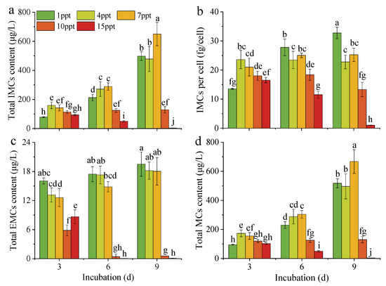 Contents of total intracellular MCs (a), intracellular MCs per cell (b), total extracellular MCs (c) and total MCs (d) under different salinity stresses on days 3, 6 and 9. Different letters a–j in the histogram indicate significant differences (ANOVA, p < 0.05).