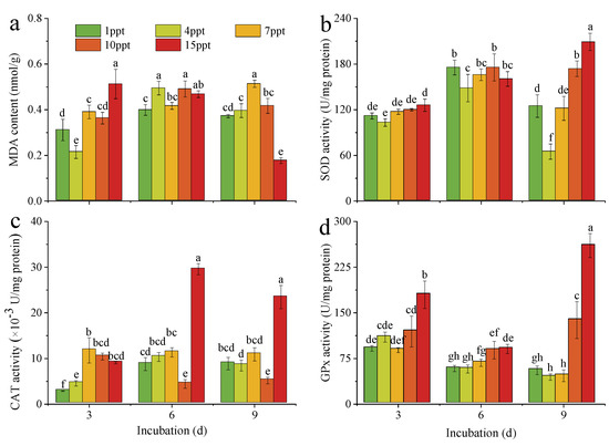 MDA content (a), and enzyme activity of SOD (b), CAT (c) and GPx (d) of M. aeruginosa under different salinity stresses on days 3, 6 and 9. Different letters a–h in the histogram indicate significant differences (ANOVA, p < 0.05).