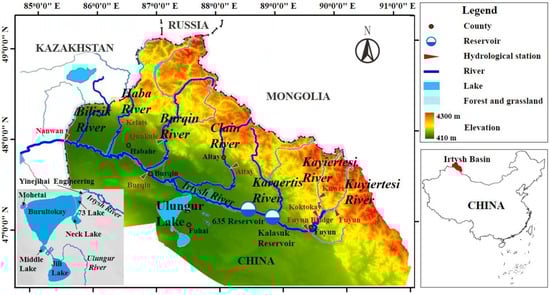 The Irtysh River is the sixth longest river globally (4248 km), with that part flowing through China having a length of 633 km and draining an area of 52,500 km2. The Irtysh River Basin (in China, the same below) has a well-developed river network, with many tributaries joining the mainstem from the right bank. As shown in Figure 1, the main tributaries of the Irtysh River include the Karaertis, Clain, Burqin, and Haba rivers. Two reservoirs, named Kalasuk and 635, have been constructed along the mainstem of the Irtysh River to satisfy water demands for socioeconomic development and the ecological environment. The basin has low precipitation, with an annual average precipitation of ~300 mm, far exceeded by annual average potential evaporation of over 1000 mm. The ecosystems found in the basin include valley forests, grassland, and the aquatic ecosystem of Ulungur Lake. The valley forests and grasslands contain non-zonal vegetation and are mainly distributed in the flooded valley areas on both sides of the main and tributary streams. The total area of forests in the study area is 235.3 km², comprising 107.3 km², 66.0 km² and 62.0 km² of forestland, woodland, and spinney, respectively. The total area of grassland is 840.0 km², comprising 370.0 km², 212.0 km², 104.7 km², and 153.3 km² of meadow grassland, desert grassland, sand grassland, and reed wetland, respectively. The buried depth of groundwater in the Irtysh River Basin is 1–4 m. Flooding of the floodplain during the annual flood season promotes considerable surface water replenishment of groundwater. This flooding process provides an excellent habitat for the growth and reproduction of valley forests and grasslands, forming unique natural landscapes and rich biodiversity, and an associated range of socioeconomic benefits. The Ulungur Lake is recharged from both the Irtysh and Ulungur rivers and consists of two lakes: the low-salinity Burultokay Lake in the north and the freshwater Jili Lake in the south. These two lakes are linked by the Kuyierga River. The Ulungur Lake has clear water and rich fish spawning habitats and acts to stabilize the regional ecological environment. The main spawning grounds of the lake include the Neck, 73, Mohetai, and Middle lakes, with the Middle Lake containing the most important fish spawning ground.
