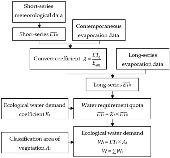 The ecological water demand of valley forests and grasslands can be calculated based on the reference crop evapotranspiration, ecological water demand coefficient, and area of valley forests and grasslands. In general, vegetation reference crop evapotranspiration can be calculated according to the Penman–Monteith Equation [] recommended by the Food and Agriculture Organization of the United Nations (FAO). However, the requirement of the Penman–Monteith Equation for a large quantity of meteorological data limits the use of this method for calculating long-sequence reference crop evapotranspiration in many regions with limited data, thereby adversely affecting the reliability of ecological water demand studies []. The strong correlation between reference crop evapotranspiration and water surface evaporation [,,] facilitated the determination of a conversion coefficient between the two factors. Consequently, the current study introduced water surface evaporation to compensate for the effects of insufficient data for calculating reference crop evapotranspiration, following which long-sequence reference crop evapotranspiration was calculated based on the observed evaporation data. The short-series meteorological and evaporation data were used to determine the coefficient for converting between reference crop evapotranspiration and water surface evaporation. Long-series reference crop evapotranspiration was then calculated based on the long-series evaporation data. This approach improved the reliability of calculated vegetation ecological water demand. Figure 2 illustrates the sequence of the calculation process.