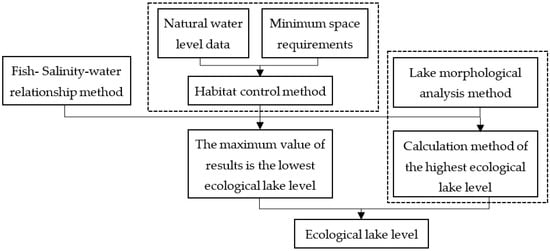 Water-scarcity challenges have contributed to the focus of recent studies on the minimum ecological water levels of lakes [,,]. However, the maximum ecological water level is also important for sustaining the ecosystem of Ulungur Lake. This study used a combination of different methods to calculate the ecological lake level, with this approach offering the possibility of improving the calculation of the ecological water demand of lakes [,]. A habitat control method, which combines the lake morphology analysis method and the fish-salinity-water relationship method, along with the highest ecological lake level calculation method, were proposed in the current study to calculate the ecological water level of Ulungur Lake (see Figure 3).