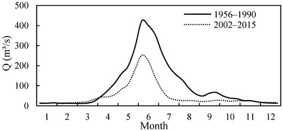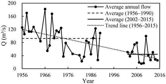 Figure 4 shows the variation in average annual river flow at the Burqin hydrological station on the Irtysh River. The average multi-year flow before the operation of the water conservancy project (1956–1990) was 92.3 m³/s, with an overall decreasing trend. The average multi-year flow from 1956 to 1969 was 120 m³/s, while it was relatively low at 70.7 m³/s from 1970 to 1986, with a minimum of 22.9 m³/s in 1982. There was an increase in river flow between 1987 and 1990, with an average multi-year flow of 87.9 m³/s. The operation of the water conservancy project resulted in a significant decrease in river flow. The results of a Mann–Kendall trend test [,] showed a significant decline in river flow (confidence interval = 95%), with a Z = −4.4. The multi-year average flow from 2002 to 2015 was 44.1 m³/s, 26.6 m³/s (37.6%), lower than the historical low water level between 1970 and 1986. In addition, river flow between 2007 and 2009 was lower than the historical minimum annual river flow.