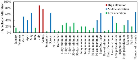 This study applied Indicators of Hydrologic Alteration (IHA) to characterize the relationship between hydrological processes and the ecological environment using five groups of indicators: (1) the monthly average flow in January–December; (2) the magnitude and duration of annual extreme water conditions represented by the annual maximum and minimum 1-, 3-, 7-, 30-, and 90-day flows and the base flow index; (3) the timing of the annual maximum and minimum 1-day flows; (4) the days and average durations of high and low flows; (5) the mean of all positive and negative differences between consecutive daily values, and the number of hydrologic reversals. The alteration of each indicator was assessed by the Range of Variability Approach (RVA), and the hydrological alteration of each indicator and the improvement in the overall hydrological alteration [,] were used to quantify the change in river hydrological processes due to anthropological activities. The hydrological alteration of each indicator was calculated as: