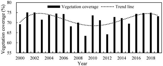 Vegetation coverage and grass yield are effective indicators of the health of the valley forests and grasslands ecosystems and can guide the sustainable development of the livestock industry []. Figure 7 shows the vegetation coverage of the study area between 2000 and 2019. Prior to the implementation of ecological regulation, change in hydrological processes resulted in an overall decrease in vegetation coverage. There was relatively low vegetation coverage in 2007 and 2015, with an average coverage of only 69.5%, a reduction of 3.8% compared to that in 2000 and 2006. The lowest vegetation coverage occurred in 2009 at 63.4%. The implementation of ecological regulation resulted in the restoration of vegetation coverage, with vegetation coverage increasing by 4.8% compared with that in 2007 and 2015 and exceeding that in 2000 and 2006, reaching 74.3%. Ecological regulation contributed to the highest vegetation coverage in 2018 of 74.9%. Table 4 shows the growth of pasture in 2013 and 2019. There was an increase in average pasture area, average height, fresh weight, and dry weight compared with that in 2013 and 2015 of 1.5%, 1.5 cm, 6.8%, and 11.3%, respectively. Dry weight is a direct reflection of the ecological and economic values of pasture. The best pasture rehabilitation effect was obtained in 2017, with a dry matter weight of 334.5 thousand kg/km², an increase of 45.0 thousand kg/km² compared with that in 2013 and 2015.