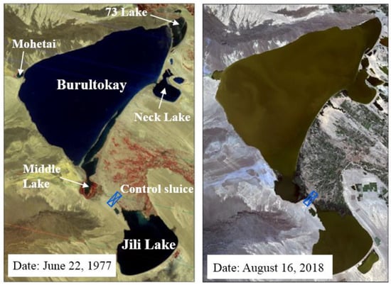 Remote sensing images of Ulungur Lake for two historical periods representing the lowest and highest water levels.