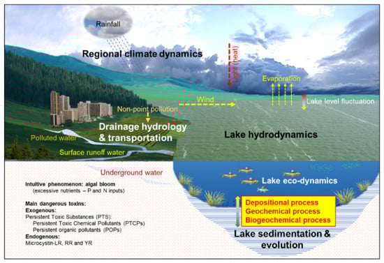 Lakes themselves and their drainages involve many important systems and dynamic processes (Figure 1). Humans directly change both global and regional climate dynamics, catchment hydrological and transportation patterns and processes, lake eco-dynamics and deposition–evolution processes. Most importantly, serious disturbance of all these processes results in the shutoff of three critical interactions: depositional processes and geochemical and bio-geochemical interactions, which can lead to the deterioration or collapse of lakes’ self-clarification ability and self-restoring capacity, effectively leaving them “dead.”