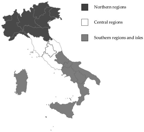 The sample considered in the empirical study was made of 71 Italian water utilities, including public, private, and public-private-owned companies. All utilities except four provided the full range of services, i.e., drinking water supply and distribution, sewerage, and wastewater treatment in line with the legislation in the area. A single utility provided the drinking water service to one of the largest Italian cities and some minor towns, while the sewerage service and wastewater treatment services were provided by the municipalities and the regional government. However, this utility had the responsibility for bill issuing and payment collection for the sewerage and wastewater treatment services, as well as the drinking water service. Data relative to the fiscal year of 2017 were retrieved from public sources, such as water utility websites, technical literature, and the databank of the financial statements of the Italian Chambers of Commerce. Figure 1 shows the structure of the sample. The whole sample was split into two groups: one including the largest number of water utilities, which provided water services to customers in the northern and central regions of Italy (48 in total), and the other containing the twenty-three utilities that operated in the southern regions and isles (Abruzzo, Apulia, Basilicata, Calabria, Campania, Molise, Sardinia, and Sicily). Hence, these two groups were associated with the same number of geographical macro-regions. For simplification purposes, the first one was denominated the NCR group, and the second one was denominated the SRI group. Figure 2 shows a map of Italy reporting the geographical macro-regions. In this study, the northern and central regions were aggregated in one single group having similar characteristics. Table 1 reports further details about the pooled sample and the two groups, presenting major statistics relative to size and ownership. On average, the water utilities in the SRI group had a larger size in terms of number of connections but were smaller with respect to the number of municipalities provided with water services. Both groups contained a greater number of water utilities classified as “public” firms, reflecting the structure of the pooled sample.