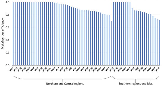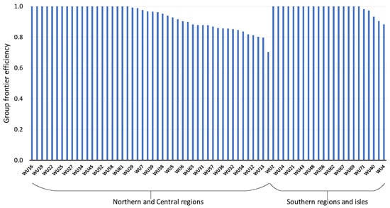 This paper applied a meta-frontier-DEA-based approach to evaluate the efficiency of 71 Italian water utilities. In order to account for the differentiation of the operating contexts, the whole sample was split into two groups: one including the water utilities that provided services in the northern and central regions and the other one including the utilities providing services to customers in the southern regions and isles. Water utilities in the southern regions and isles operated under distinct production technologies because of the different structure of investment funding, with greater availability of public grants supporting investment and an underdeveloped state of infrastructure system, which negatively affected the way service was provided. Additionally, a short-term perspective was assumed in the calculation of efficiency. In this regard, the production factors associated with the infrastructure assets were considered as non-discretionary inputs in the specification of the meta-frontier model.