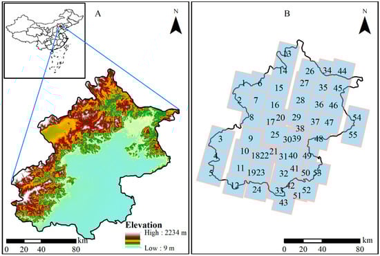Location of Beijing (A) and the coverage of GF-2 images (B).