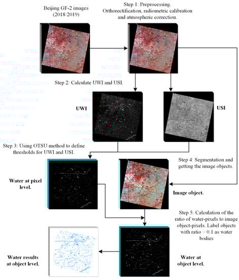 The overall framework presented in Figure 2 shows the procedures used in this study to develop a convenient and accurate extraction process for water body information on a large scale using multiple VHR optical satellite images. The proposed method comprises five main steps: (1) Image preprocessing; (2) Water index (WI) calculation; (3) Pixel-level water body information extraction via WI thresholds definition; (4) Image segmentation and object extraction; (5) Calculation of the proportion of water pixels to the corresponding image object pixels and water body detection.