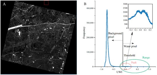 UWI image (A) and histogram of its pixels’ frequency distribution (B). In (A), bright colors are water bodies and shadows, while dark color is the background.