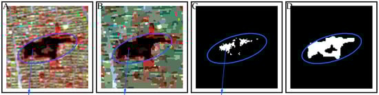 The dried water basin (which is normally a river) exhibited a seasonal characteristic, that is, the seasonal rain has led to a river flow cut-off (Figure 11A). It is difficult to avoid misclassification in such situations. When analyzing high-resolution images, due to the limited swath width of the high-resolution satellite and the cloudy and rainy weather in the rainy season, it is very difficult to obtain images on the same date to cover the entire study area. Thus, a large number of images covering a longer time span is usually required. This condition causes some images to be acquired during the non-rainy season. At present, few studies focus on the identification of dried water bodies and there is also no corresponding mature application. In this case, the dry water body identification was augmented through visual interpretation, so that the river object maintained its integrity (Figure 11C).
