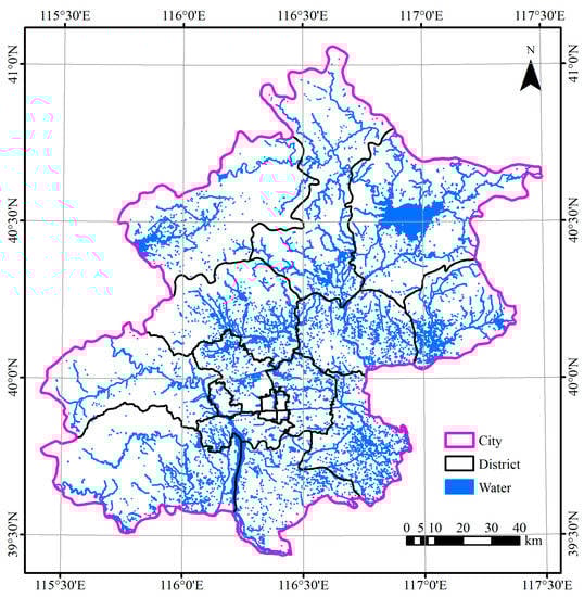 Beijing is situated at the northern tip of the North China Plain (39°28′–41°05′ N, 115°25′–117°30′ E) and covers a total area of 16,410.54 km2. The western, northern, and northeastern regions of Beijing are primarily mountainous, with altitudes ranging from 1000 to 1500 m. The southeastern part is a plain with altitudes that range from 20 to 60 m. The climate is hot and humid in the summer and cold and dry in the winter, with prominent warm temperate and semi-humid continental monsoon climate characteristics []. The topography and climate characteristics cause the region of Beijing to feature large water bodies such as lakes, reservoirs, rivers, and many small water bodies such as ponds and canals.