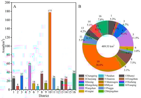 Area distributions of surface water in each district of Beijing in 2018/2019. (A) Area of the water in each district; (B) percentage of the water area in each district to the total water area.