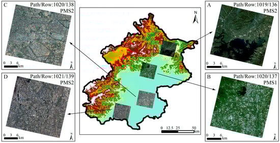 In this paper, Beijing, the capital of China, is taken as the study area (Figure 1A). Beijing is the capital of China and the country’s political, economic, and cultural center. It is located in the Haihe River basin, in an area that suffers from a water resource shortage and a water quality problem []. Surface water accounts for about 1/3 of the total water resources in Beijing and is directly related to the economy, agriculture, life, and environment. Therefore, Beijing’s surface water situation needs to be studied to support water resource supply analysis and management. However, previous surveys or studies have not used VHR images to obtain water bodies information throughout the entire Beijing.
