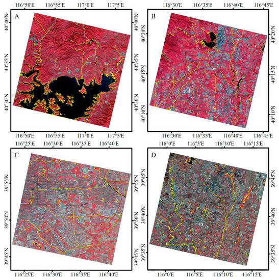 Four typical testing images (R: Band 3; G: Band 2; B: Band 1) (A–D) from north to south were used to assess accuracy in this study. The four images included mountain, plain, urban, and rural areas.