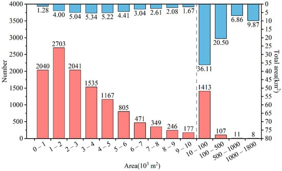 According to statistics of the results, in 2018/2019, there were 13,073 ponds with a total area of 108.01 km2 in Beijing (Figure 9). We classified ponds with an area less than 10,000 m2 in bins of width 1000 m2. The ponds with areas of 1000–2000 m2 were the most abundant, with 2703 bodies covering a total area of 4.00 km2. They were followed by 2041 ponds with areas of 2000–3000 m2 spanning 5.04 km2. There were also 2040 ponds smaller than 1000 m2 and spanning a total of 1.28 km2. Beijing had 1413 ponds with areas in the range of 10,000–100,000 m2, covering 36.11 km2, and 107 ponds in the range of 100,000–500,000 m2 with a total area of 20.50 km2.