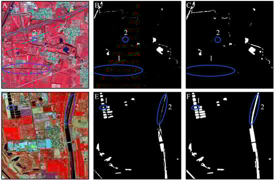 Comparison of the surface water extraction results before and after applying the object detection module. Column 1: (A,D), two false color sample images; Column 2: Pixel-level water extraction results in (B,E); Column 3: Water extraction results with the two-level pixel-object method (C,F). 1 and 2 are surface water sample objects.