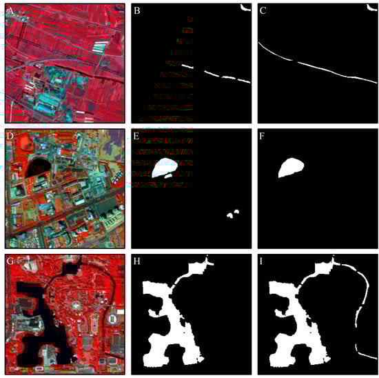 Column 1: False color images; Column 2: Detected water bodies before post-classification improvement; Column 3: Detected water bodies after post-classification improvement. Illustrations are dried out (A–C), misclassified (D–F), and unclassified and misclassified (G–I) water bodies.