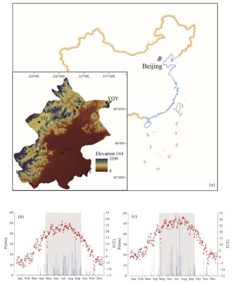Beijing, the capital of China, is in the northern rim of the North China Plain (Figure 1a). Due to the typical continental monsoon climate, there are four distinct seasons in Beijing. The non-monsoon season is cold and dry, due to northerly winds blowing from high-latitude areas, while the monsoon season is hot and wet because of the east and south airflow carrying moisture from the southern Pacific Ocean and Indian Ocean [,]. The annual precipitation is 574 mm, of which 70% occurs during the monsoonal season from May to September (Figure 1b,c). The average annual temperature is approximately 12 °C. The mean air temperature in the mountain area is lower (10.2 °C at YQ station) than that in the plains (15.1 °C at BTC station).