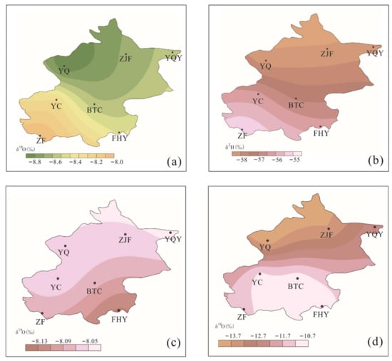 Mean annual gridded values of stable isotopes compositions of meteoric waters over Beijing (a) δ18O, (b) δ2H, (c) δ18O during summer seasons, and (d) δ18O during winter seasons.
