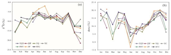 Seasonal changes in δ18O were similar at all stations (Figure 3a), with a broad maximum, −2.0~−9.5‰ and −19.2~−67.7‰ for δ18O and δ2H values, respectively, during the summer months. The minima, −9.1‰~−21.5‰ and −157.6~−45.8‰ for δ18O and δ2H values, respectively, occurred in the winter months. Such a seasonal variation was also observed by Wen et al. (2010) [] for both vapor and precipitation isotopes at a station in Beijing, and by Yamanaka et al. (2004) [] for multi-year precipitation isotopes in the northern North China Plain.