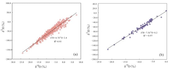 Correlation between δ2H and δ18O values for Beijing precipitation in 2015: (a) δ2H and δ18O values of individual samples (n = 539): δ2H = 6.7δ18O − 2.4; and (b) monthly amount-weighted average δ2H and δ18O values (n = 77): δ2H = 7.5δ18O + 8.2.