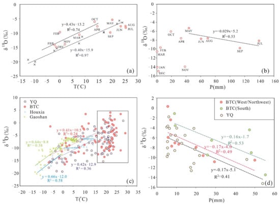 To demonstrate and interpret the relationship more clearly, daily data from BTC and YQ stations were selected for further evaluation. For daily data, δ18O only correlated well with T when T was below 16 °C, and the gradient of the T effect at the two stations was similar, with a value of 0.4‰/°C. When T was above 16 °C, the T effect disappeared, as shown by the scattered points indicated with a rectangle in Figure 5c. It should be noted that conditions with T > 16 °C only occur in the monsoon season.