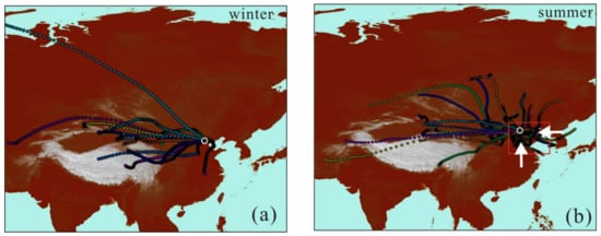Moisture trajectories obtained from the HYSPLIT model through the layer from the surface to 1500 m for 72 h at the beginning of precipitation during the (a) winter and (b) summer seasons. The white point indicates BTC station. The rectangle covers the moisture trajectories from south and east.
