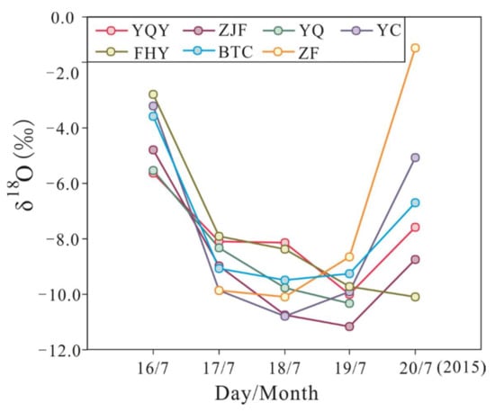 Figure 7 displays the isotopic variations during rainfall events at seven stations. A decreasing isotopic trend was observed during the first four days, in good agreement with the Rayleigh distillation model. However, an increasing trend for isotopes was observed on 20 July 2015 with the addition of a new air mass. The increasing isotopic compositions were first found at BTC, ZF, and YC stations, indicating a southwestern moisture source. This is in agreement with the HYSLTIP results shown in Figure 8. Moisture extended from offshore areas westward over Beijing during the first four days, while air from further inland contributed more to rainfall on 20 July 2015.